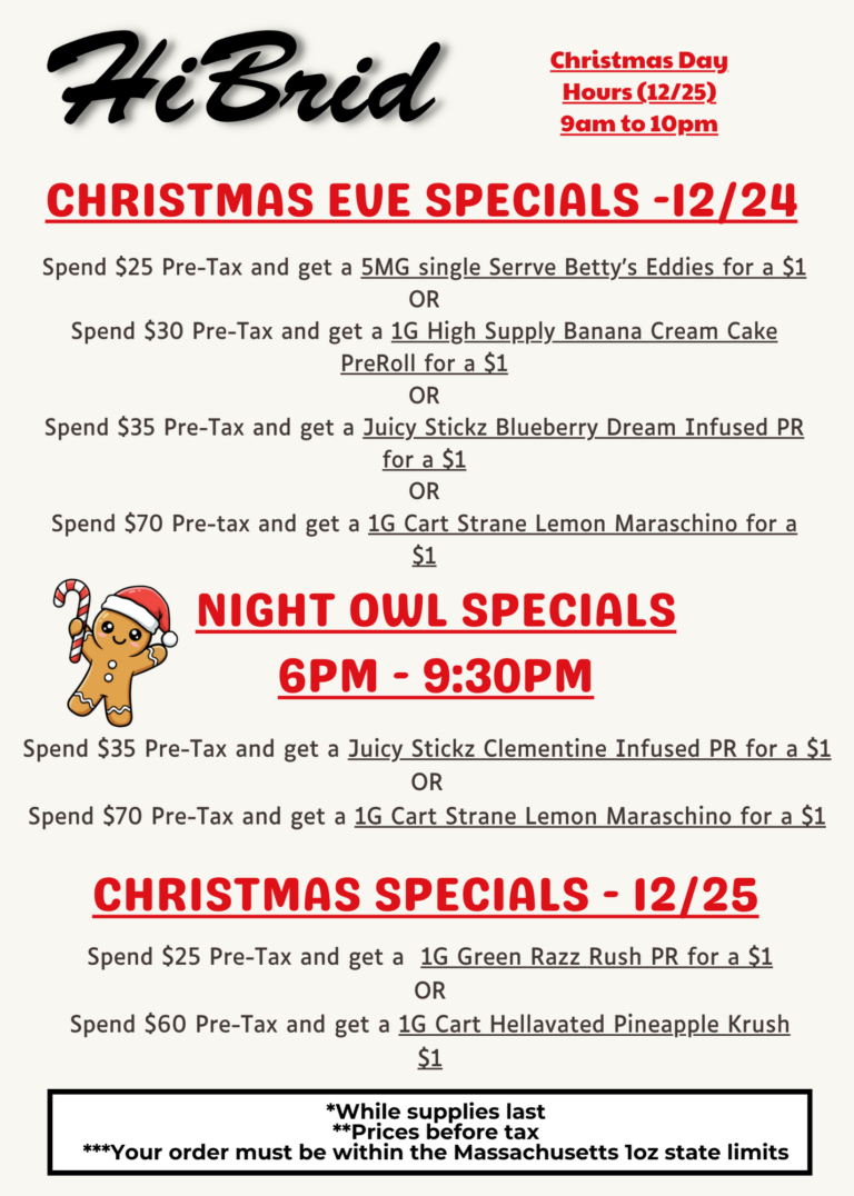 Come, check us out. “Always Packed Fresh. Always HiBrid.”       |        We are open 365 days a year, 7 days a week, including holidays.       |       Spark Up the Holidays — Your Favorite Strains, Merry Prices     |       Christmas Day (12/25/25) Hours: 9am to 10pm.