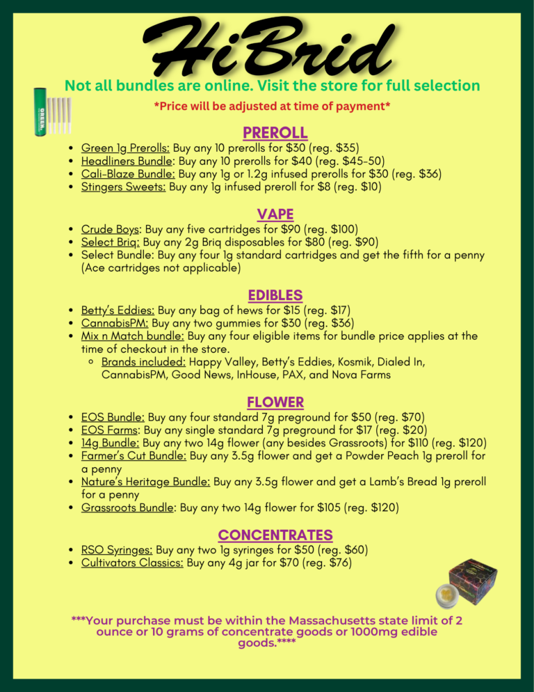 Come, check us out. “Always Packed Fresh. Always HiBrid.”       |        We are open 365 days a year, 7 days a week, including holidays.       |       Early Bird Special from 9am to 11:30am (Daily) In-Store Only    |      Dime Day – Every 10th, 20th and 30th of the month – Buy any two 2g vape (4g total) for $112.50.     |    “2 oz limit = double the fun 😮‍💨💨 Pull up & stock up. #420”